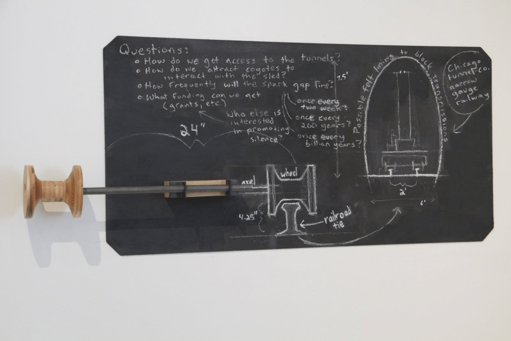 H.Y.L.O.ZO.I.S.M was a sculptural research project undertaken with collaborator Marissa Benedict. In this project, we looked to Joseph Beuys to react to the Chicago landscape and its potential. We grounded our research through a set of proposals. The first proposal was to stage a performance of pulling a huge sled of symbolic blocks of material along the abandoned railroad line (which existed at that time) which has now become the 606 trail in Wicker park. The second proposal was to create a sled to be pulled by Cayotes through the abandoned narrow gauge mail train track that runs below downtown Chicago. This sled would hold a spark gap generator powerful enough to jam city cell phone communications and would be powered by vats of bacteria pulled from lake Michigan mud. This project embraced the research process–including performative expeditions to collect mud from lake Michigan, to collect clay from Terra Cotta, Illinois, to create our own felt, to bake salt blocks. The project archived the intense conversation and theoretical research we through ourselves into to work out what these proposals met to us and our City.