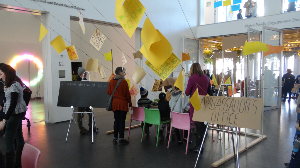 I created this participatory performance for Family Day at the MCA. Staged as an “ambassor’s office”, this performance centered around a very simple collaborative drawing game that can be done with children of many ages but also explored the broader idea of non-verbal communication. Interrupting the participatory game were performances in which we used semaphore to communicate with specific art works in the gallery. Completed drawings were hoisted up as flags up to the third floor balcony of the museum. Performers: Ben Stagl, Hannah Barco, Jorges
