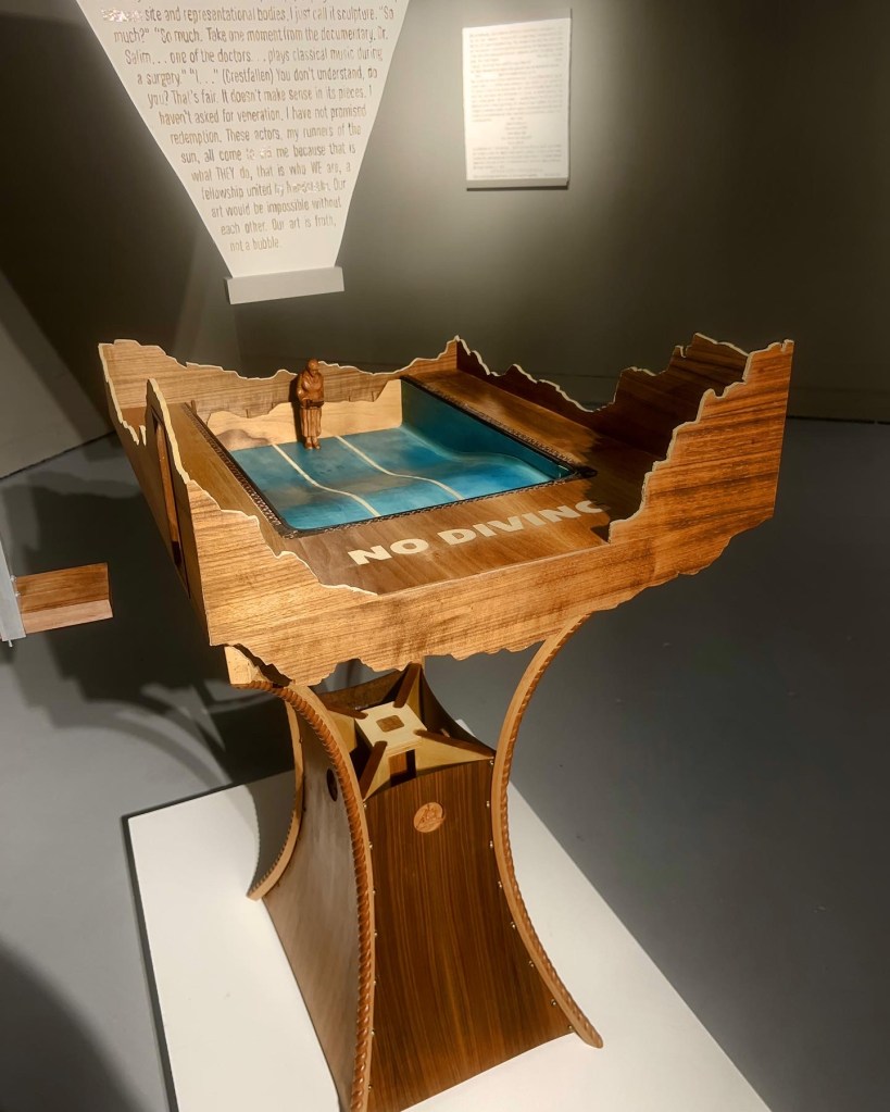The characters that populate Barco’s story about the theater group are modeled on real artists in his community and the location of this story–a disused swimming pool in the basement of a building in downtown Chicago–is a real place he once visited and dreamed of using for performance. The project’s texts, written by Barco, present the perspectives of the different characters, inviting viewers to move back and forth across different viewpoints to piece together the layers of the story.